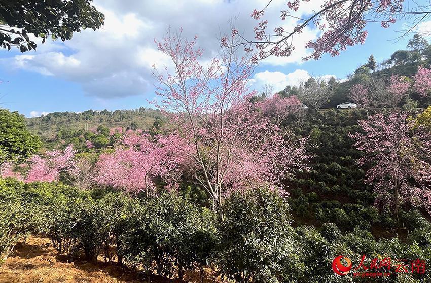 景迈山冬樱盛开,与茶树相映成趣。人民网 尹馨摄