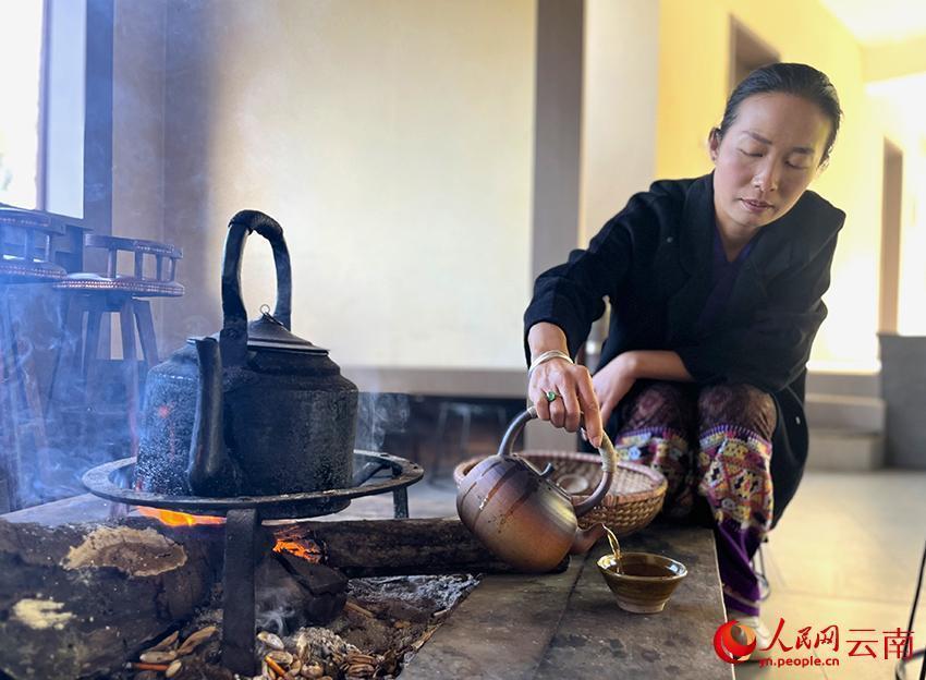 玉芭在火塘前为游客制作傣族烤茶。人民网 尹馨摄